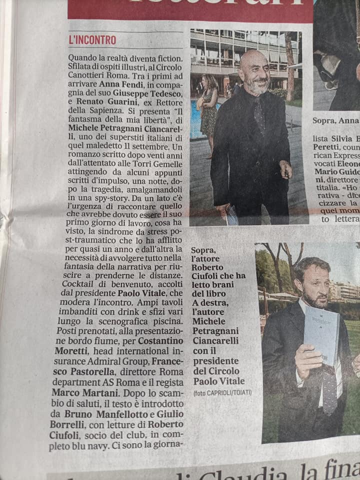 Dove? Be’… La città è magica, la location dell’evento superlativa e l’occasione assolutamente imperdibile. Martedì 28 settembre 2021, alle ore 18:30, presso Circolo Canottieri ROMA – pagina ufficiale, si è tenuta la presentazione del libro “Il fantasma della mia libertà” di Michele Petragnani Ciancarelli Edizioni Effetto Come da articolo sul Corriere della Sera, per l’occasione sono intervenuti nomi illustri come Giulio Borrelli, Bruno Manfellotto, Roberto Ciufoli e molti altri.