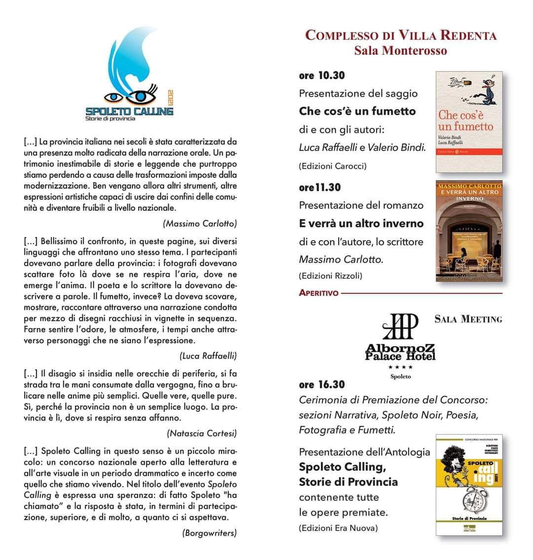 Nel frattempo, ecco qualche anticipazione sugli eventi e sull’antologia che verrà presentata in anteprima durante la manifestazione. Si tratta per me di un’esperienza unica, poiché ho avuto il privilegio non solo di selezionare i racconti finalisti in quanto membro della giuria tecnica, ma anche di curare l’editing dei testi inseriti nella raccolta “Spoleto Calling 2021 – Storie di Provincia”, Edizioni Era Nuova. Il libro racchiuderà al suo interno tutte le opere finaliste di ogni sezione: racconti (gialli e narrativa), poesia, fumetti e fotografia.